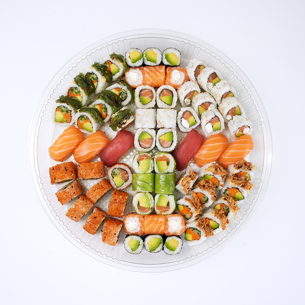 Assortiment de 64 pièces composé de 9 dream rolls, 9 spicy Saumon Rolls, 8 Crunch Veggie Rolls, 8 Wakame Veggie Rolls, 6 Roll'in Salmon Cheese, 6 makis california, 6 makis avocat, 6 verde maki saumon, 4 sushis saumon, 2 sushis thon