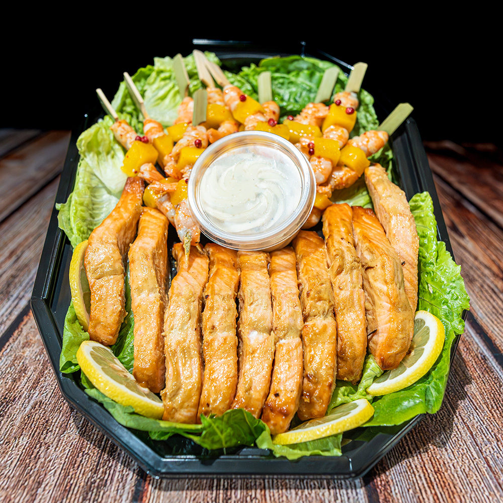 Plateau de brochettes crevettes marinées et mangues & saumon rôti laqué avec aïoli