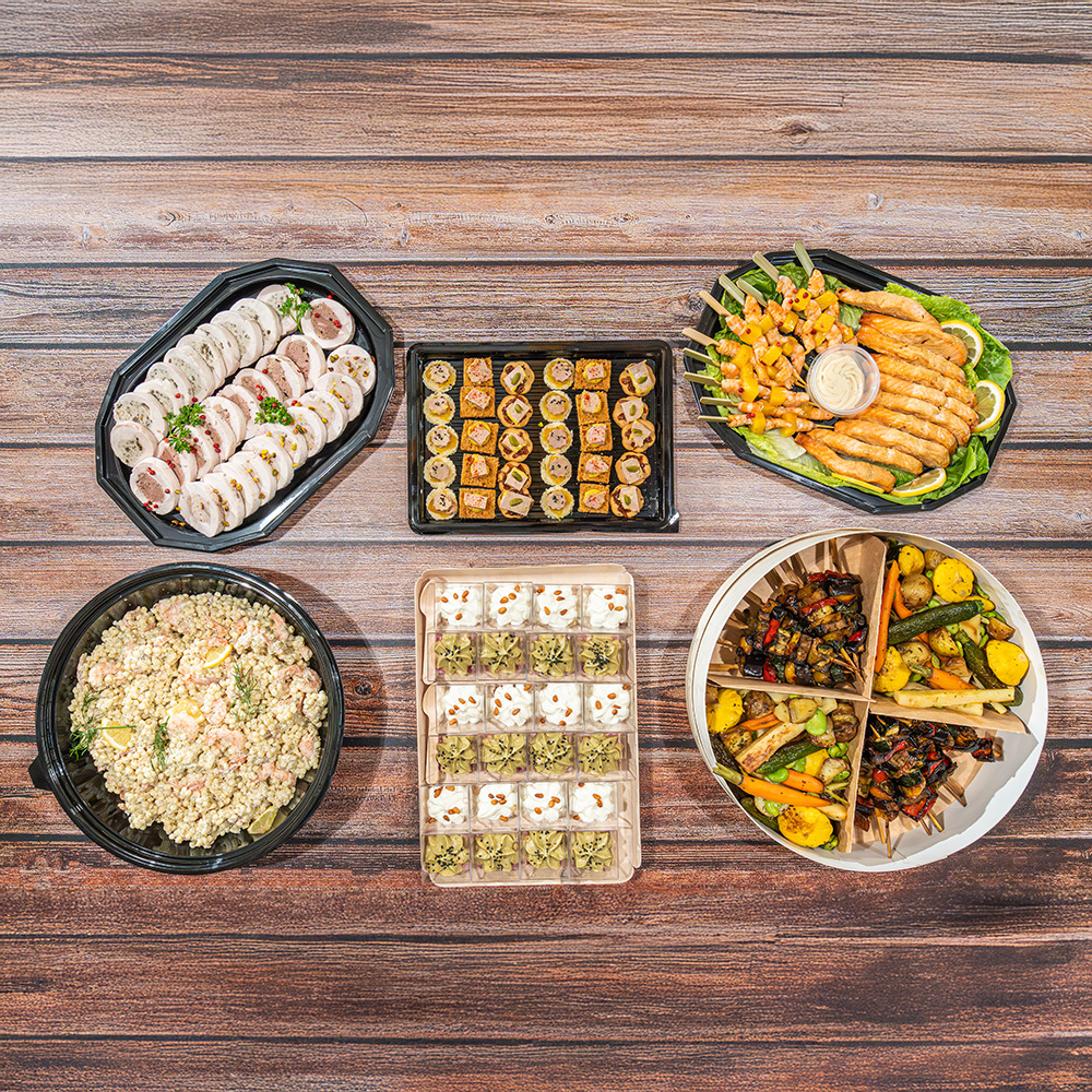 Le grand buffet est un menu froid pour 10 personnes disponible au retrait du 21 Novembre au 20 Décembre. Il comprend : AMUSES-BOUCHES Plateau verrines festives ET Plateau bouchées foie gras & chutneys ENTRÉES Grande salade perles au saumon fumé ET Plateau ballotines 3 façons PLATS & ACCOMPAGNEMENTS Plateau de brochettes crevettes marinées et mangues & saumon rôti laqué avec aïoli ET Mini brochettes de légumes & poêlée de légumes glacés FROMAGE Assortiment 6 variétés ET Pain tranché (4 baguettes) DESSERT Bûche : framboise ou marron (au choix)