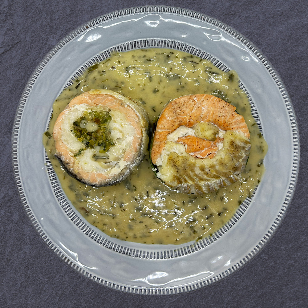Soit 9,95 € pièceL'idylle Marine : Saumon et lieu noir maries à une sauce onctueuse à l'oseille