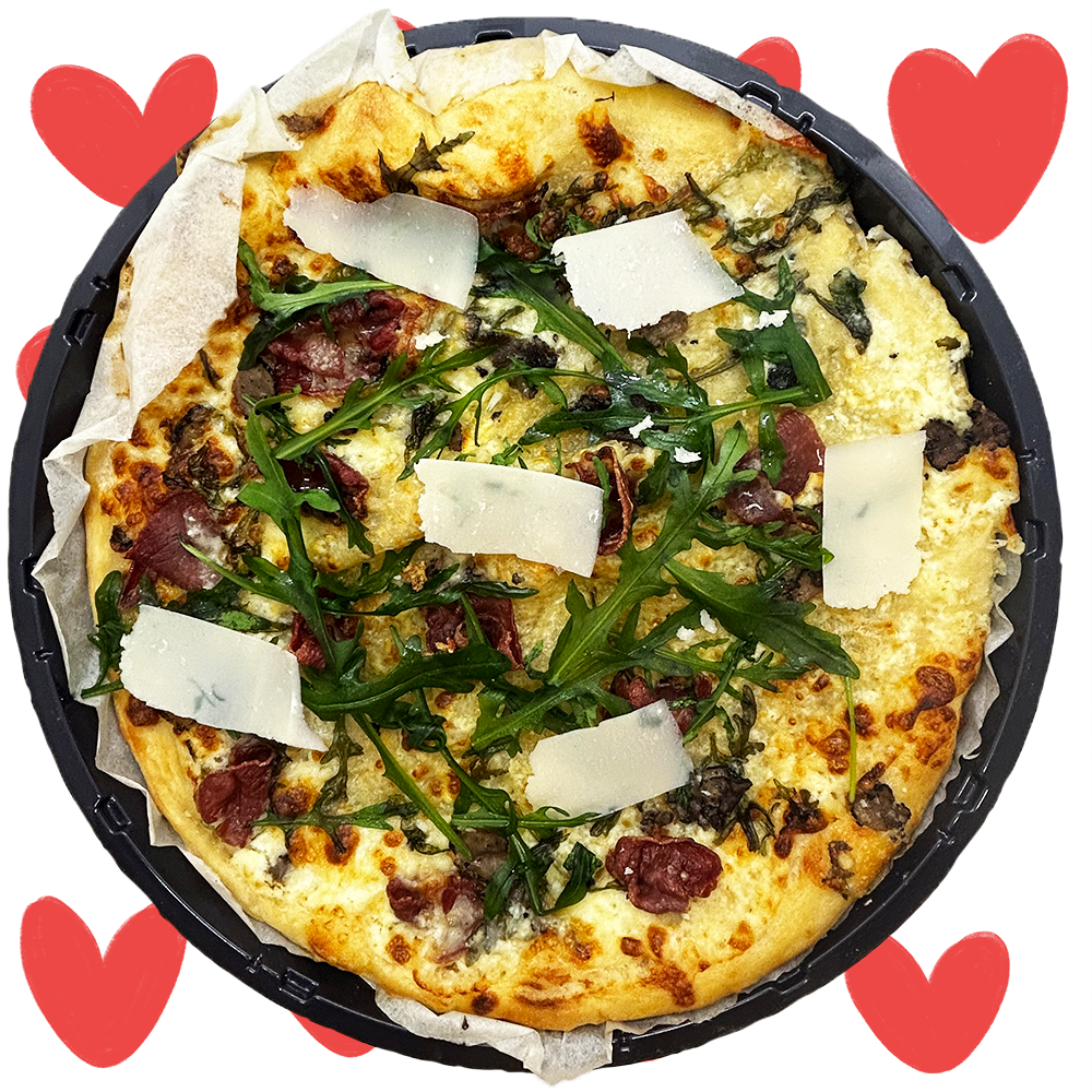Pizza St Valentin : pizza blanche à la truffe et au speck, copeaux de parmesan et roquette.