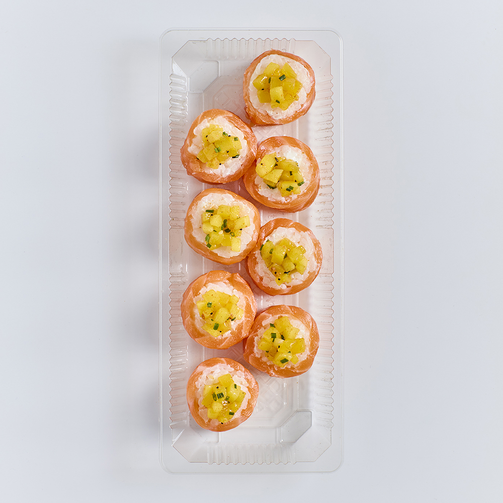 Ingrédient : 90g Riz à sushi, 70g Saumon, 35g Fromage frais, 12g Tartare mangue